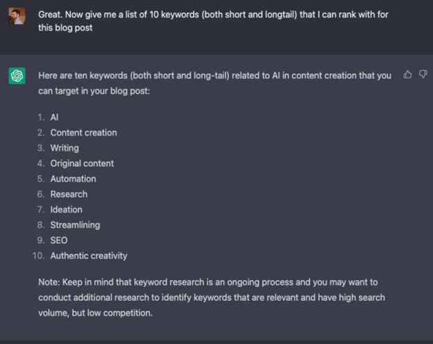 For professional copywriters and content creators who need their content to rank well, this is going to be a powerful new way to utilize AI. Following the same example I used above, I could ask ChatGPT to follow up on the title and subheadings with some keywords: