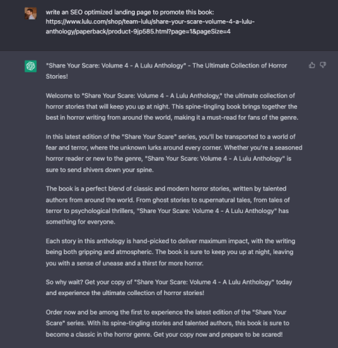 I asked for an SEO-optimized landing page for an edition of our Share Your Scare books. This is precisely the kind of page you’ll want to create when launching a new book or running a campaign to promote a book you’ve already published.