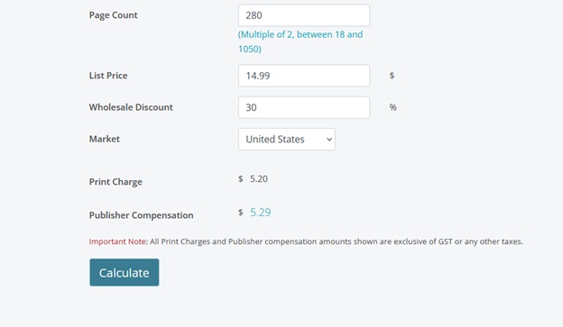 Use IngramSpark’s Publisher Compensation Calculator to determine the cost of your book. As a sample for comparison, I chose to calculate using  a 6×9, 280-page paperback priced at $14.99.